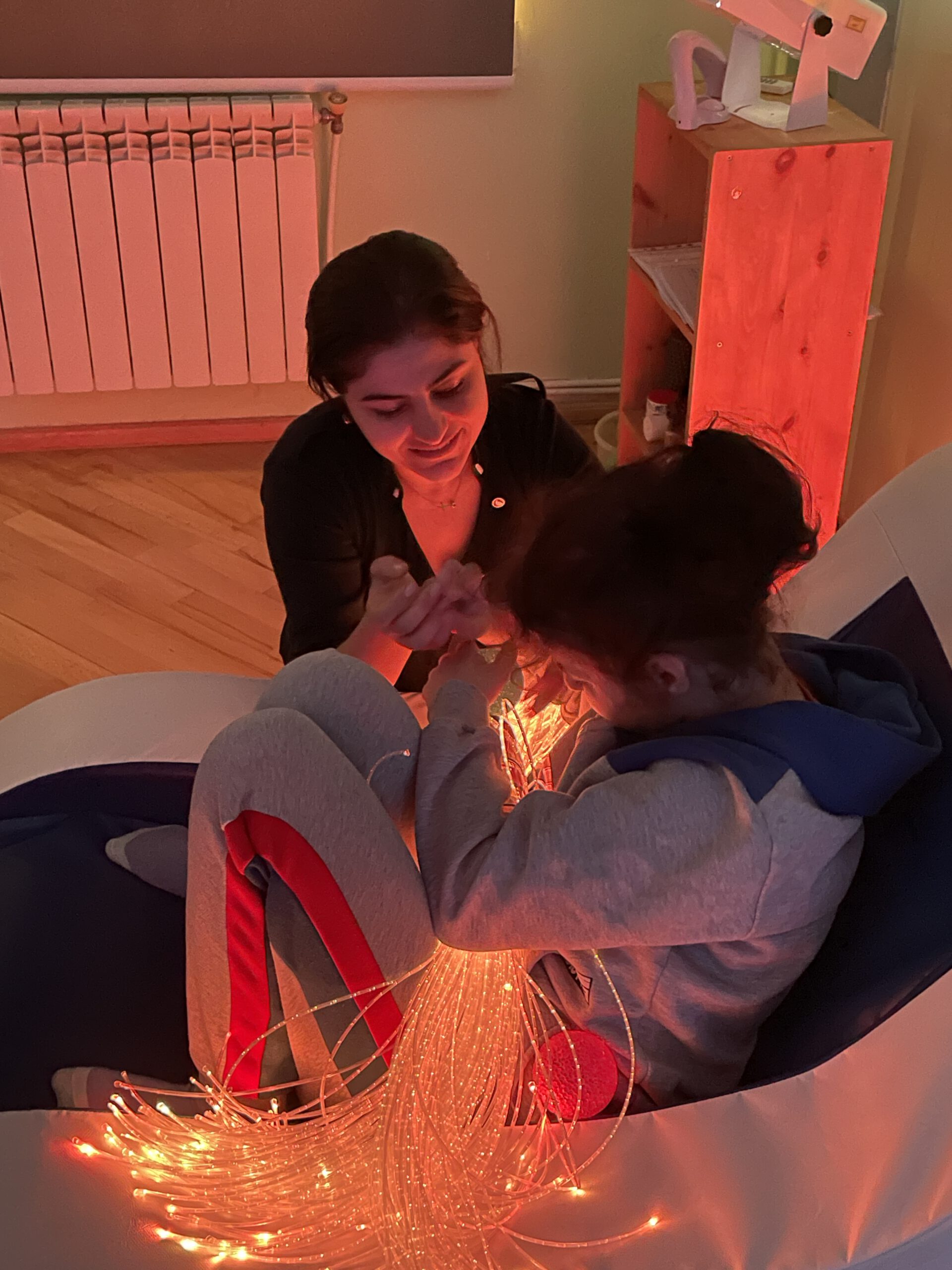 Harutyun laat ons trots de snoezelruimte zien en we spreken daar met specialisten die het gebruiken. We zijn onder de indruk. Een meisje met ernstige spasmen, ligt uren ontspannen op het bed, welke langzaam beweegt. Een slechtziend meisje is ontspannen aan het voelen aan lichtslierten en wat ballen met reliëf. En een jongen in de hoek is heel blij en ontspannen als hij naar de bubbelbuizen kijkt. De gedrevenheid van de specialisten valt ook hier op.De specialisten zijn door twee Nederlandse dames geïnstrueerd in het gebruik van de snoezelruimte. Ze hebben geleerd persoonlijke plannen te maken voor elk kind. Zo is voor iedereen duidelijk wat elk kind nodig heeft in de ruimte.
