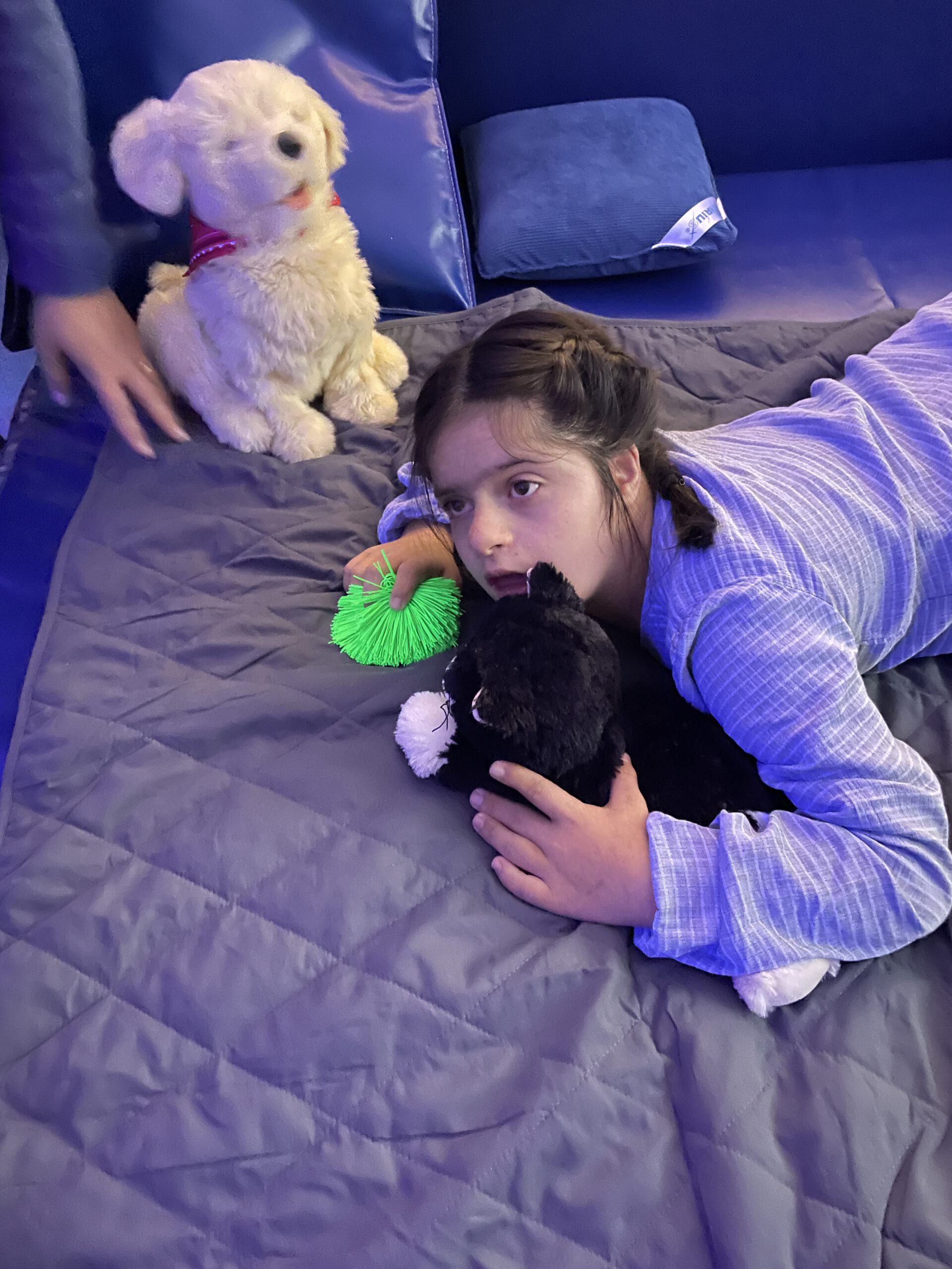 Op het waterbed ligt Silvester, de begeleidster verteld dat zij 3 keer per week 2 uur lang op het waterbed ligt. Silvester is vaak erg onrustig. Op het waterbed welke verwarmd is en lichte trilling geeft ligt ze samen met de hond en de kat. De hond blaft en daar reageert ze meteen op. De kat ruikt naar lavendel en ook dat werkt rustgevend.