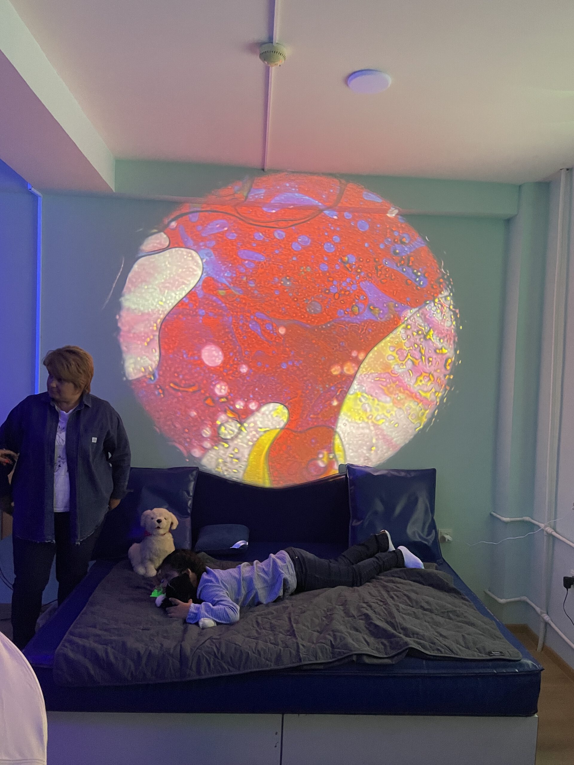 Vervolgens zetten wij onze reis voort richting Gyumri, waar we het kindertehuis bezoeken onder leiding van Lidia. We worden hartelijk ontvangen door Lidia en Hasmik. Ze zijn heel erg blij met de snoezelruimte en vertellen ons heel enthousiast dat het hele dagen gebruikt wordt. Dat zien we ook aan de schema’s die er hangen op de deur.